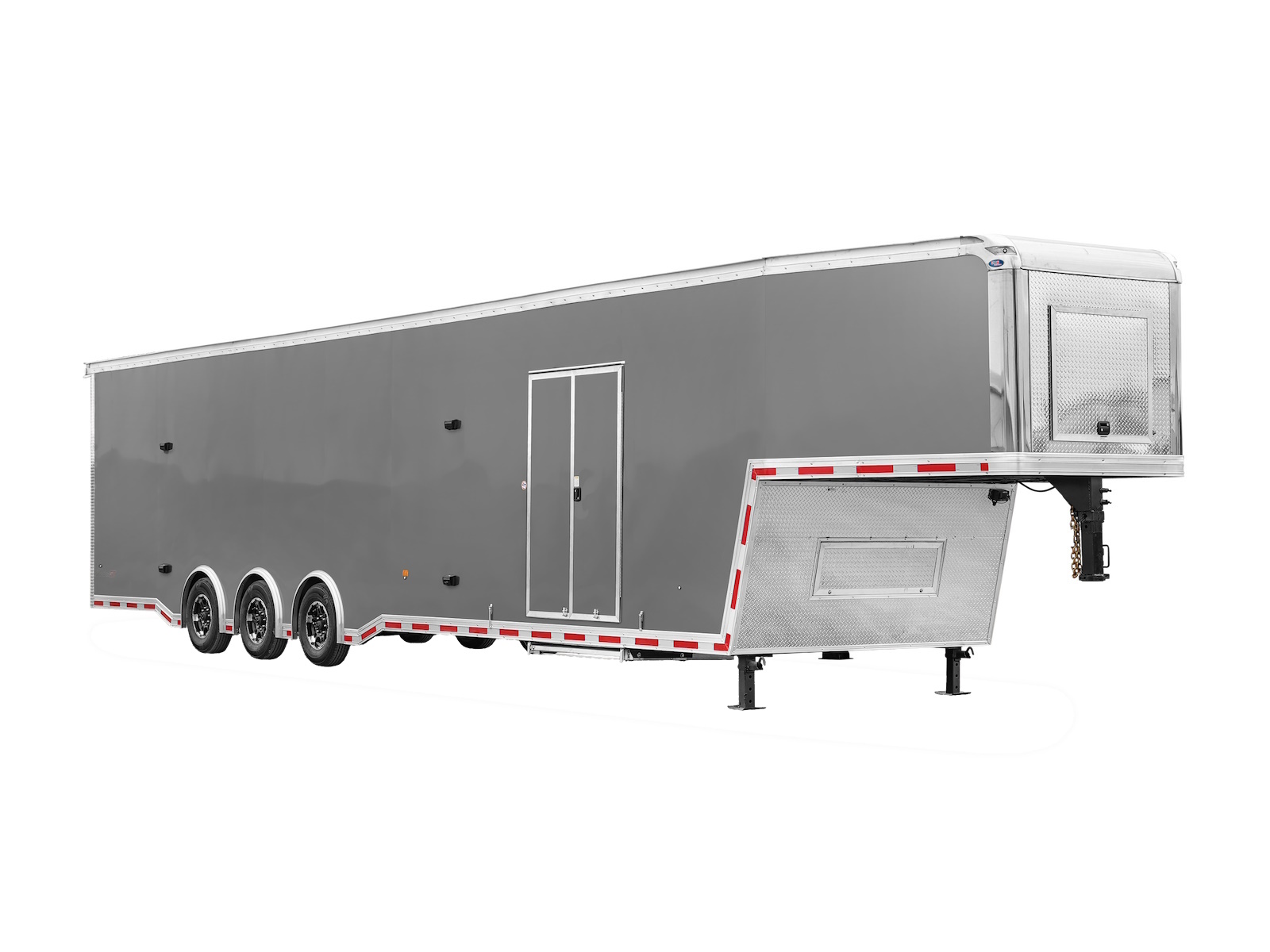 The Premier Gooseneck Race Trailer is a professional-grade custom trailer. The Premier Gooseneck Race Trailer is our top-of-the-line trailer, waiting to be customized. It’s fully loaded from floor to ceiling with strength, safety and functionality in mind. This design positions the weight of the trailer over the truck’s rear axle to minimize sway. The tight turning radius of a Premier gooseneck trailer makes cornering a breeze. Premier’s gooseneck design features a truck body extrusion built on tube main frame construction and 16” on-center frame, tube sidewalls and roof bows. A screwless aluminum exterior and a one-piece aluminum roof add to Premier’s durability, while front- and rear-cast corners with stainless-steel inserts add to the fit and finish.